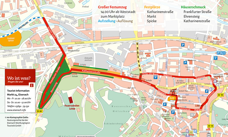 Der Festumzug verläuft von der Adam-Opel-Straße über: Kasseler Straße – Frankfurter Straße – Ehrensteig (Stiegk) – Katharinenstraße – Georgenstraße – Hinter der Mauer – Sophienstraße – Nikolaistraße – Karlsplatz – Johannisstraße – Johannisplatz – Schmelzerstraße – Marktplatz – Georgenstraße – Hospitalstraße (dort löst sich der Festumzug auf)